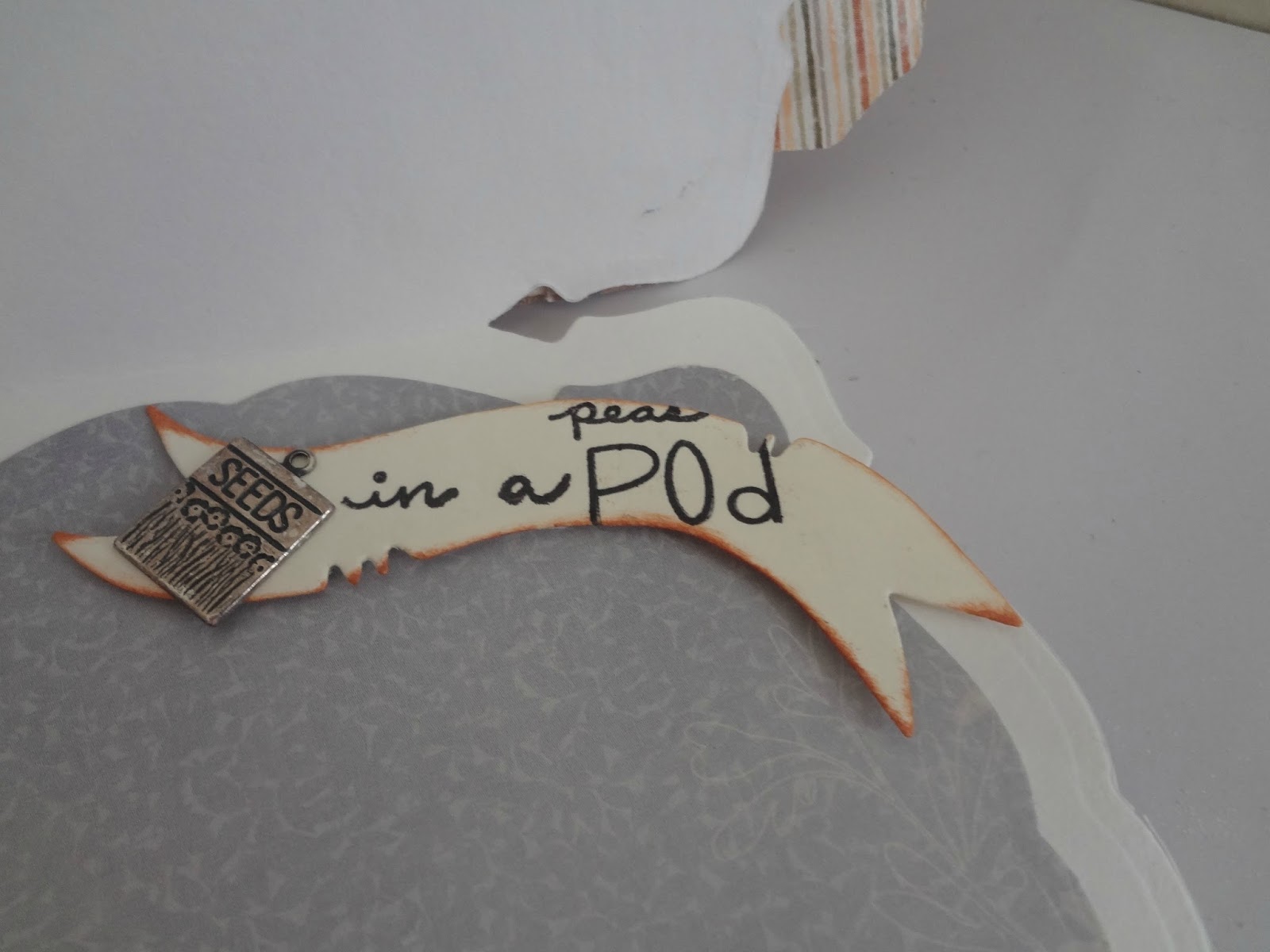 The shape of the card is from Go Kreate. The main dies are from Magnolia, the wheel behind the image is from little darlings rubber stamps. The peas....ahhh the pea pod die! Its from Spellbinders and also come with a carrot and an awesome sentiment which you will see in the pics below. I used Nuvo drops to make the peas in the pod. On the Tilda with red hair, the green in her hairband is also Nuvo but the glow in the dark Nuvo which I could not resist.